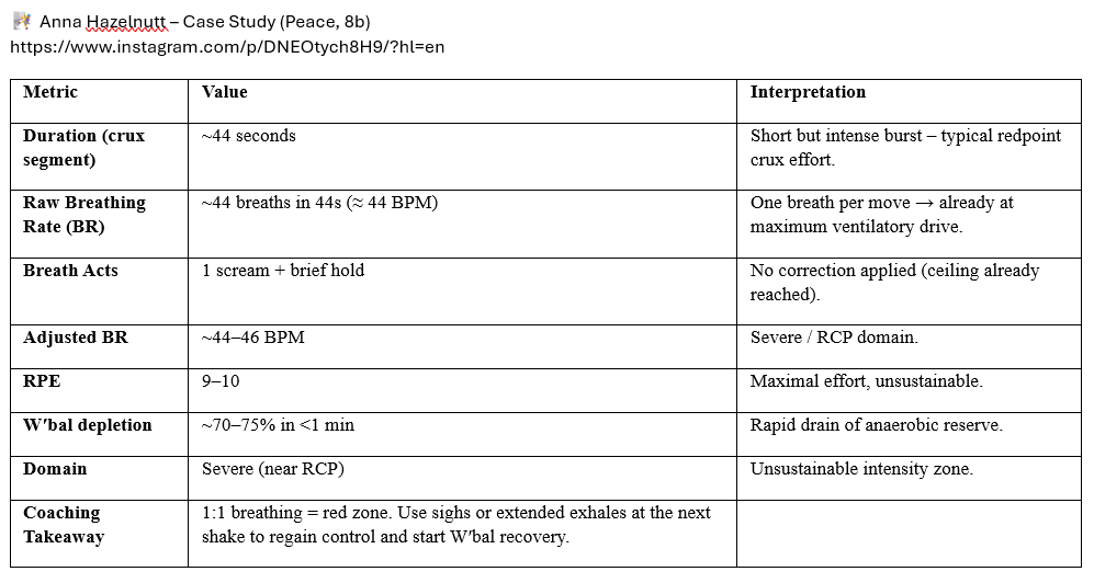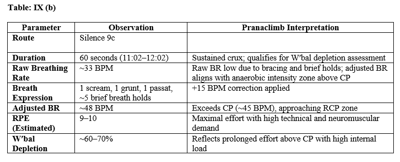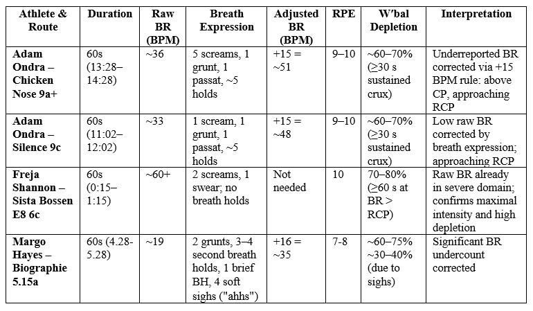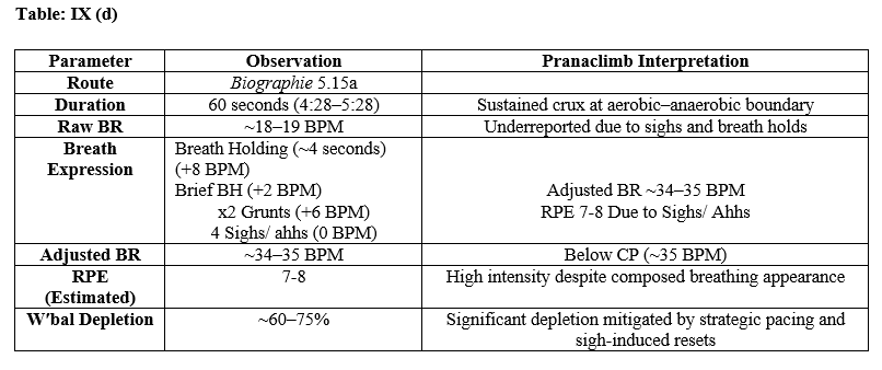 During Margo Hayes’ crux sequence on Biographie, the raw breathing rate was recorded at approximately 19 BPM. However, this deceptively low value reflects significant underreporting due to expressive breathing acts that compress ventilatory effort. Closer analysis identified a 3–4 second breath hold at the start, 2 forceful grunts and a sigh during high-tension moves, a brief grunt, and 3 audible sighs ("ahhs") near the end. Applying Pranaclimb’s BR adjustment logic—+8 BPM for breath holding, +2 BPM for a brief BH, +6 BPM for grunts, and 0 BPM for sighs—the total correction amounted to ~+16 BPM, yielding an adjusted breathing rate of ~34–35 BPM. Although this adjusted BR remains below the established Critical Power threshold (~45 BPM), the elevated Rate of Perceived Exertion (7-8) and the presence of breath holding and sighing suggest that Margo’s metabolic intensity was likely near CP, with breath control strategies compressing ventilatory frequency despite high physiological effort. This example highlights the need to incorporate duration-based breath hold adjustments in the Pranaclimb methodology to accurately estimate workload in climbing scenarios where expressive breathing significantly masks true ventilatory demand.