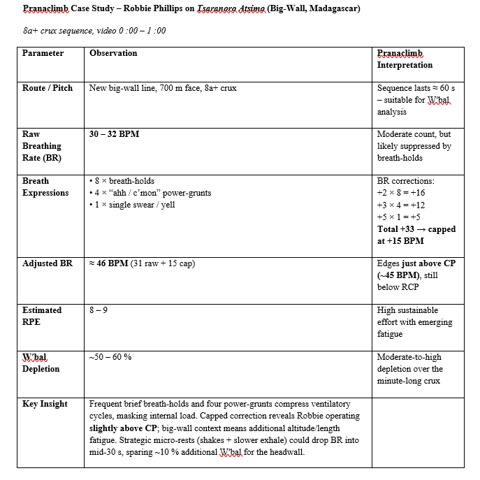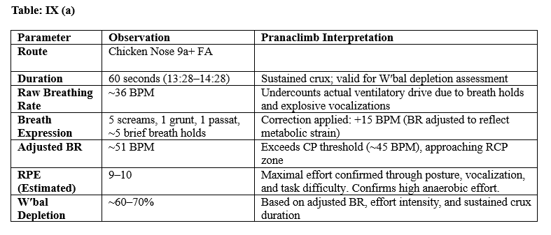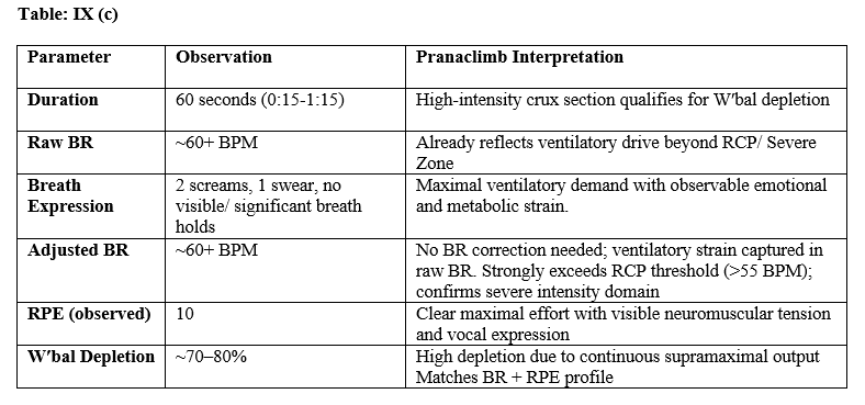 Adam Ondra’s ascent of Chicken Nose (13:28–14:28) provides a textbook example of apparent BR undercounting during high-intensity effort. Over the 60-second crux, raw breathing rate was ~36 BPM. However, five power screams, one grunt, one passat, and approximately five brief breath holds were observed—each reflecting high ventilatory strain and isometric tension. Applying the Pranaclimb BR correction (+15 BPM) raised the adjusted BR to ~51 BPM, placing him above CP and nearing RCP. The estimated RPE was 9–10, confirming a maximal anaerobic effort. W′bal depletion was ~60–70%, consistent with a prolonged crux well into the severe intensity domain. This illustrates the need for expressive-breathing correction in overhanging sequences with explosive or inverted movement.